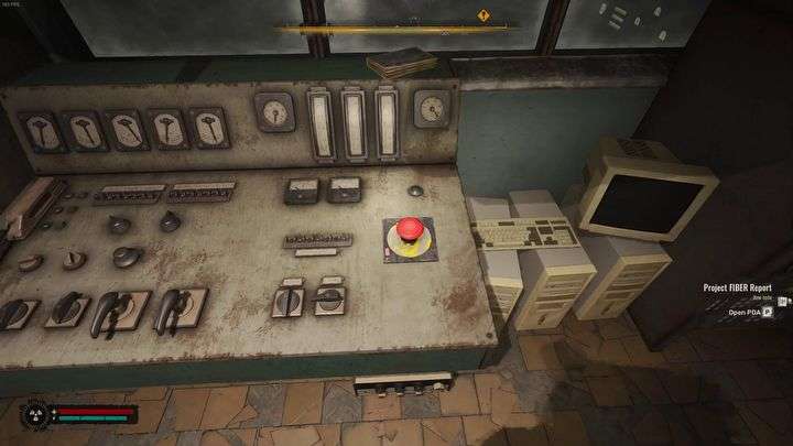 V horním patře najděte místnost s počítači a projděte dveřmi do schodiště. To vás dovede do kontrolní místnosti. Stiskněte červené tlačítko na palubní desce.
