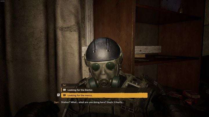 Vstupte do budovy rozbitým oknem vzadu. Promluvte si s zraněným žoldákem ležícím vedle komody. Řekne vám více o Doktorovi.