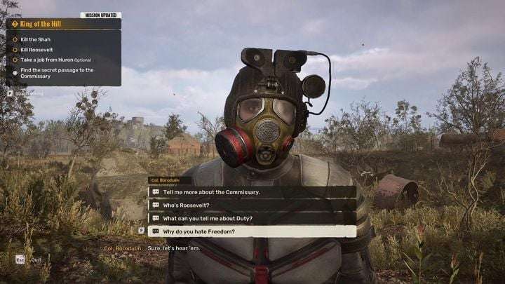 Před útokem na Roosevelta se můžete setkat s Borodulinem, bývalým členem frakce Duty. Najdete ho severozápadně od Varana úkrytu.
