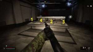 V další místnosti narazíte na hádanku, ve které musíte kliknout na kombinaci čtyř tlačítek ve správném pořadí. Počítáno zleva, správné pořadí je: